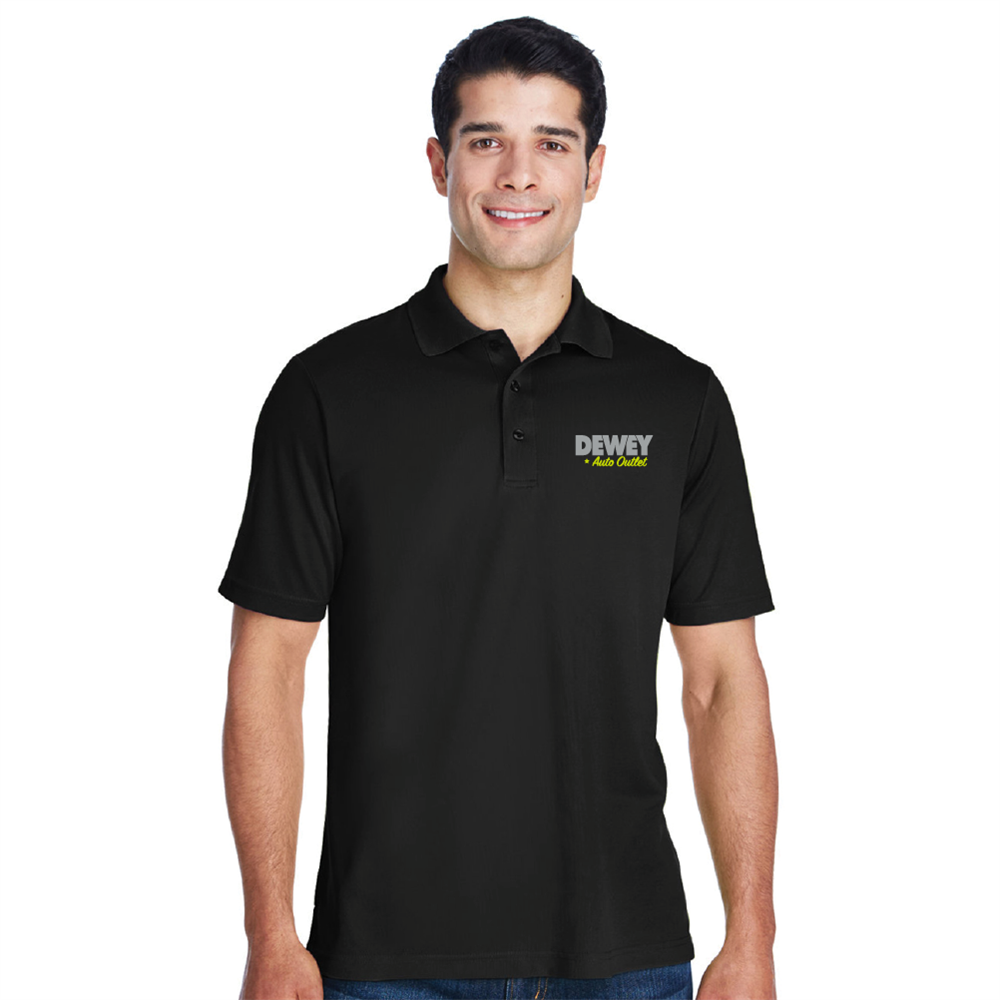 4.1 oz 100% polyester pique, with moisture wicking, antimicrobial, and UV protection performance this polo is suitable for uniforms and outdoor activities and features a three-button placket and a matching flat knit collar. Available in sizes S-4XL with the Dewey Auto Outlet logo embroidered on the left chest.