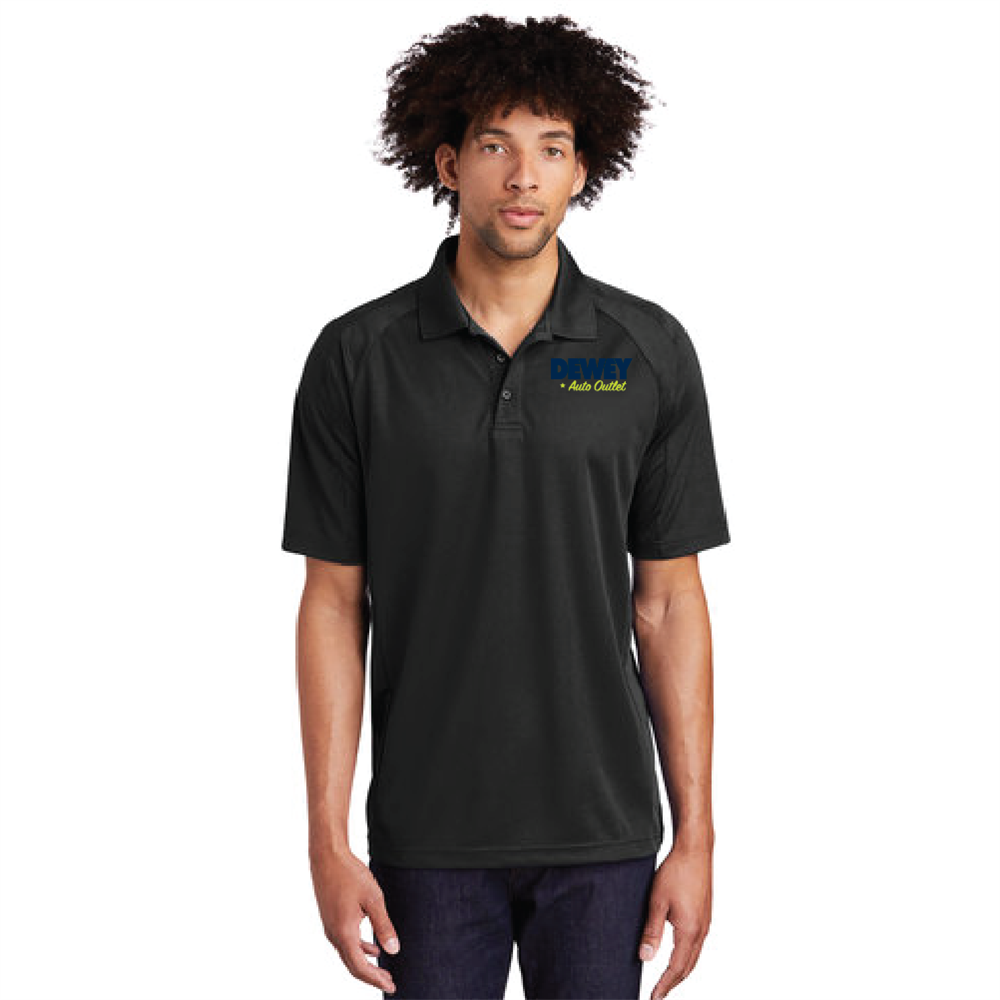 mobility. Polo features a tag-free label, flat knit collar, and 3-button placket with dyed-to-match buttons. The Dewey Auto Outlet logo is embroidered on the left chest.