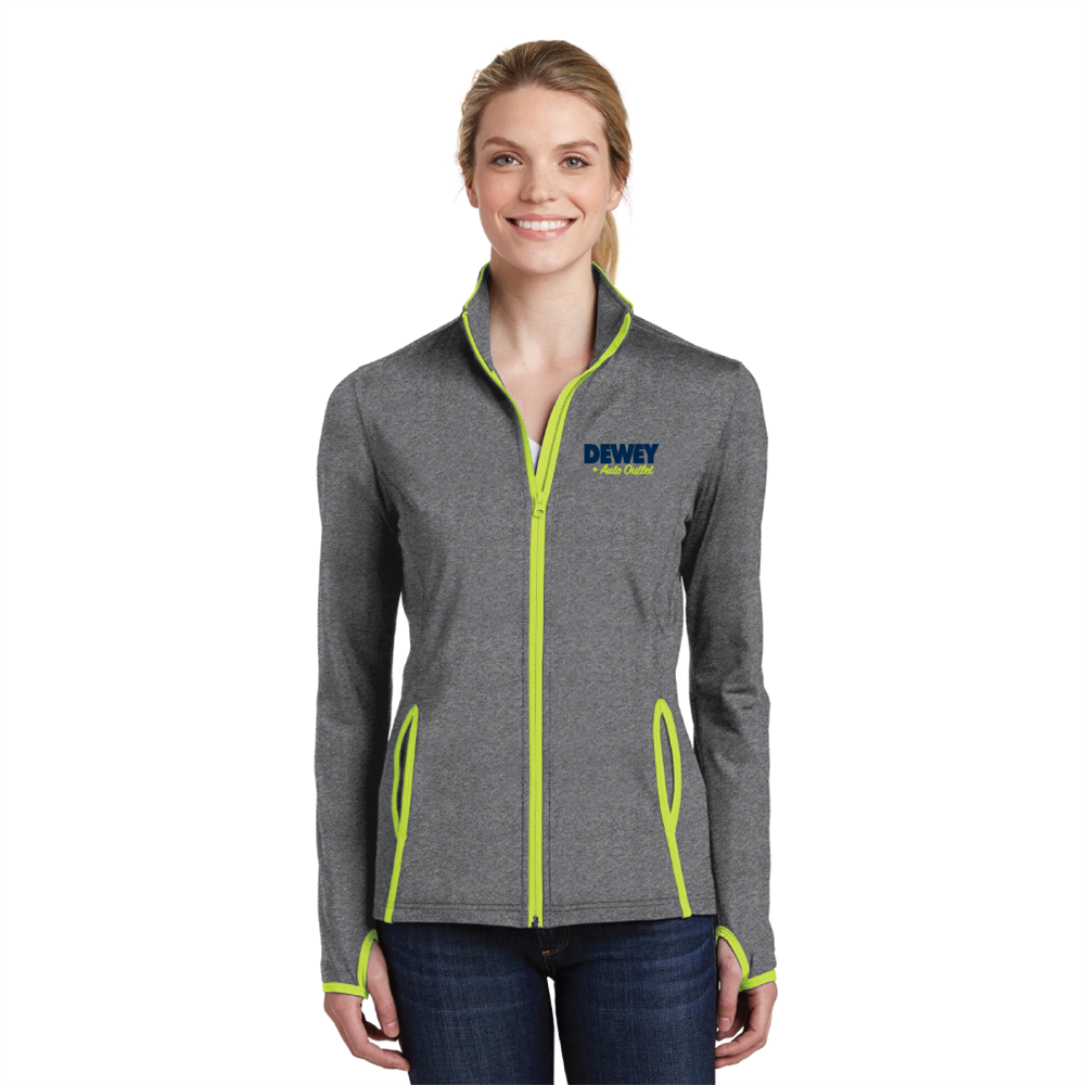 Keep moving in this 6.8-ounce, 90/10 poly/spandex moisture-wicking, soft-brushed jacket that's flexible and features hits of contrast color throughout.. Jacket features a cadet collar with contrast piping, contrast reverse coil zipper, set-in sleeves, contrast cuff binding, and contrast welt front pocket. Available in sizes XS-4XL with the Dewey Auto Outlet logo embroidered on the left chest.