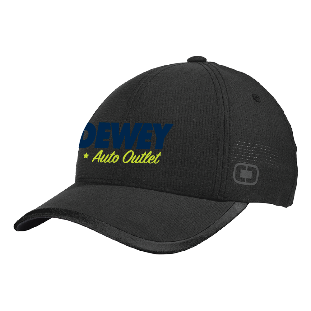 100% polyester pinhole woven mesh cap features a black reflective O heat transfer on side panel, black reflective welding on bill, OGIO seam taping. Low-profile hook and loop with black reflective stacked O heat transfers. Available with the Dewey Auto Outlet logo embroidered on the front of the cap.