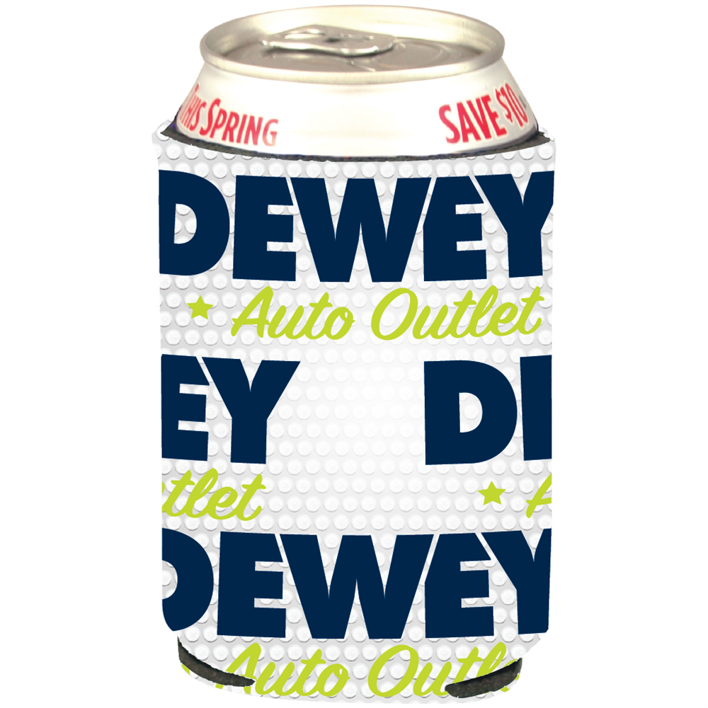 Collapsible koozie folds flat for convenient storage and fits most beverage consoles including cars, boats, riding mowers, golf carts and more. Made with durable polyester covered scuba foam to insulate your beverage, and holds 12-16 oz. cans, water bottles or longneck bottles. Available in Cool White Background with Step and Repeat full color Dewey Auto Outlet logo.