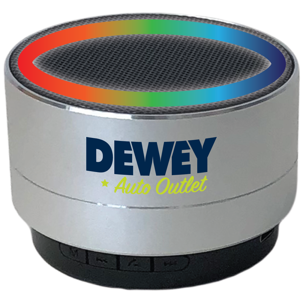 Our Budget LED Lightup Bluetooth Speaker features crisp clear sound from your bluetooth device, while allowing full speakerphone operation for conference calls. Each speaker contains an integrated FM scan radio for listening to local FM stations and a TF card slot to listen to a micro-SD card loaded with your MP4 music. Its unique color changing rainbow LED flashes a full spectrum of rich color to the top and bottom edge while playing your favorite tracks. Each unit includes a USB/micro USB charging cable with built in FM Antenna and its internal rechargeable Li-ion battery will provide 3-4 hours of sound per charge. Available in silver aluminum case with the Dewey Auto Outlet logo.