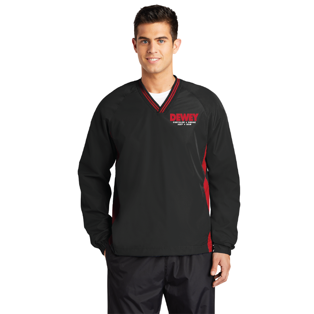 Cool, windy days are no match for this 100% polyester, rib knit v-neck collar soft wind shirt. With tipping on the collar and at the gussets, it boasts simple lines, a quiet hand and true team-oriented style. This wind jacket features Raglan sleeves with articulated elbows for greater mobility and a left side seam zipper for easy on/off. The jersey lining with mesh insets at gussets for add breathability with half elastic, half self-fabric cuffs for comfort. The Dewey Chrysler * Dodge * Jeep * Ram logo is embroidered on the left chest.
