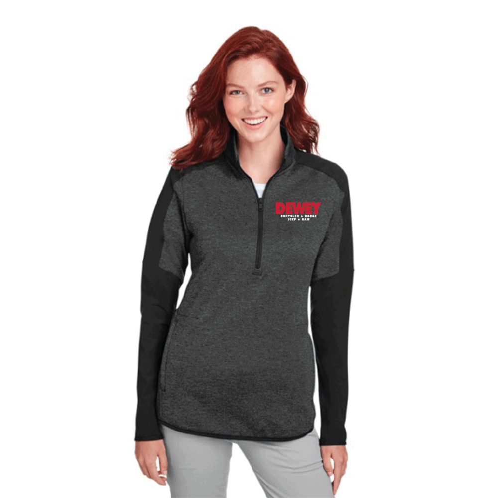 Show off your brand on the Under ArmourLadies' Qualifier Hybrid Corporate Quarter-Zip. The Colorblock Polo features moisture wicking HeatGear fabric and flat back mesh inserts that keeps you cool, dry and comfortable. Available in sizes XS-3XL with the Dewey Chrysler * Dodge * Jeep * Ram logo on the left chest.