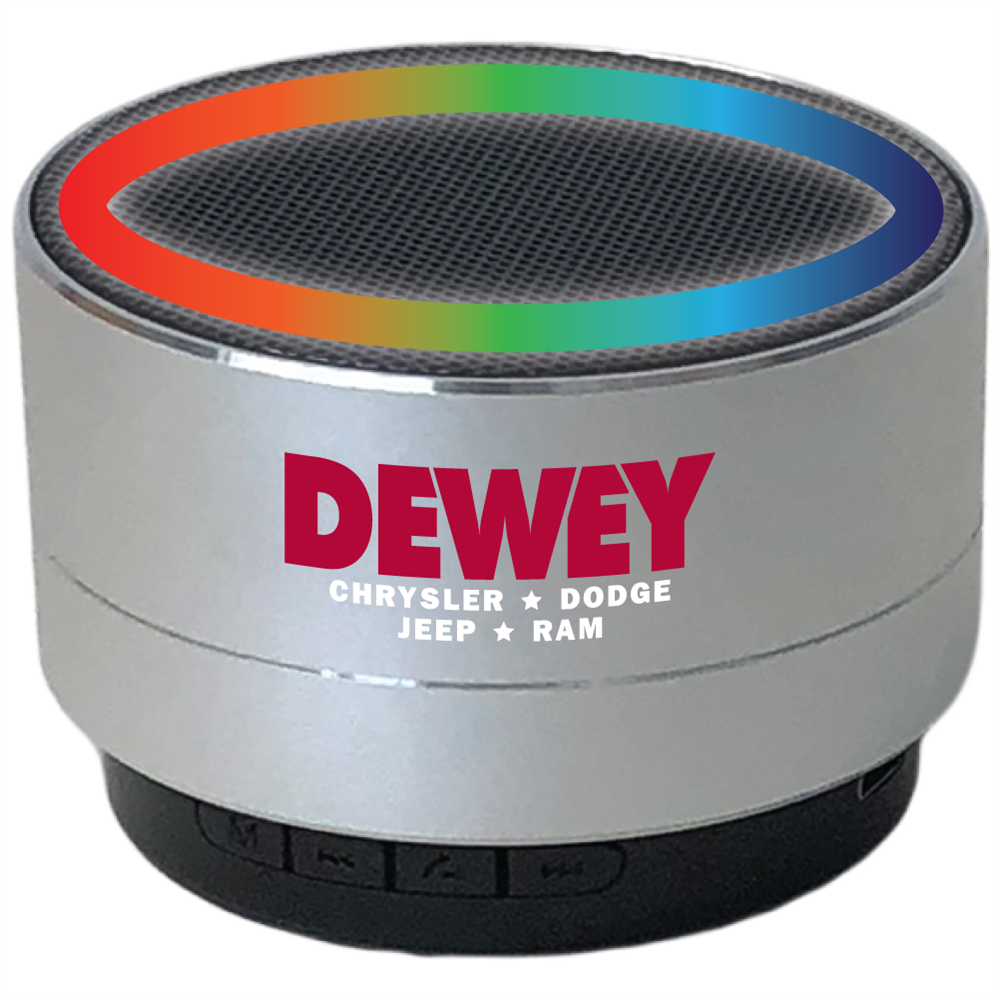 Our Budget LED Lightup Bluetooth Speaker features crisp clear sound from your bluetooth device, while allowing full speakerphone operation for conference calls. Each speaker contains an integrated FM scan radio for listening to local FM stations and a TF card slot to listen to a micro-SD card loaded with your MP4 music. Its unique color changing rainbow LED flashes a full spectrum of rich color to the top and bottom edge while playing your favorite tracks. Each unit includes a USB/micro USB charging cable with built in FM Antenna and its internal rechargeable Li-ion battery will provide 3-4 hours of sound per charge. Available in silver aluminum case with the Dewey Chrysler * Dodge * Jeep * Ram logo.