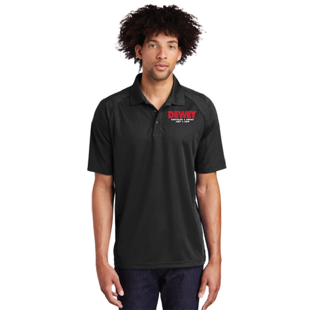 mobility. Polo features a tag-free label, flat knit collar, and 3-button placket with dyed-to-match buttons. The Dewey Chrysler * Dodge * Jeep * Ram logo is embroidered on the left chest.