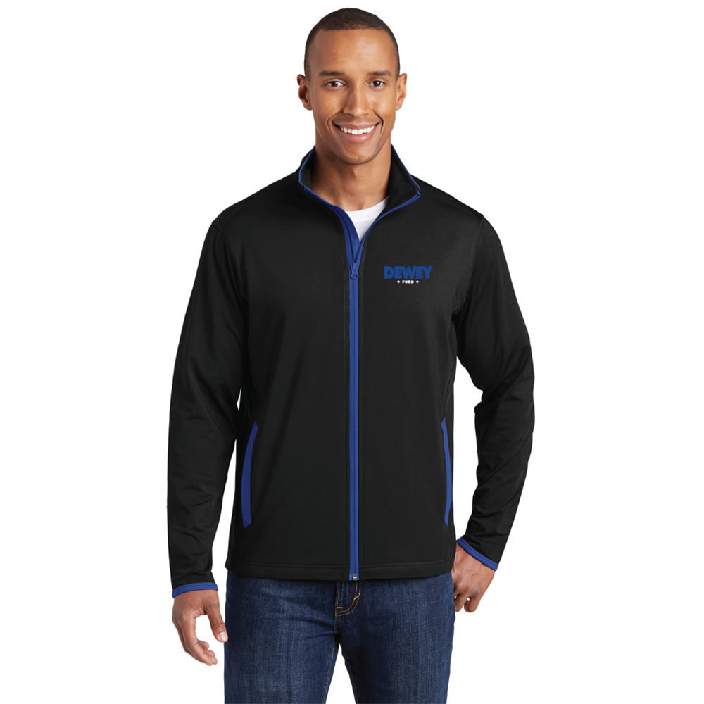 Keep moving in this 6.8-ounce, 90/10 poly/spandex moisture-wicking, soft-brushed jacket that's flexible and features hits of contrast color throughout.. Jacket features a cadet collar with contrast piping, contrast reverse coil zipper, set-in sleeves, contrast cuff binding, and contrast welt front pocket.  Available in sizes XS-4XL with the Dewey Ford logo embroidered on the left chest.