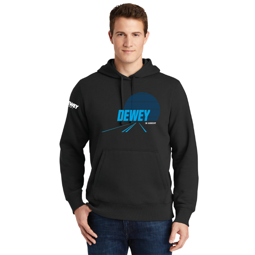 This athletic style, 9-ounce, 65/35 ring spun combed cotton/poly fleece hooded sweatshirt has rib knit cuffs and waistband, set-in sleeves, a twill-taped neck and a front pouch pocket. The Dewey Ford logo across the front chest and sleeve as shown in the image.