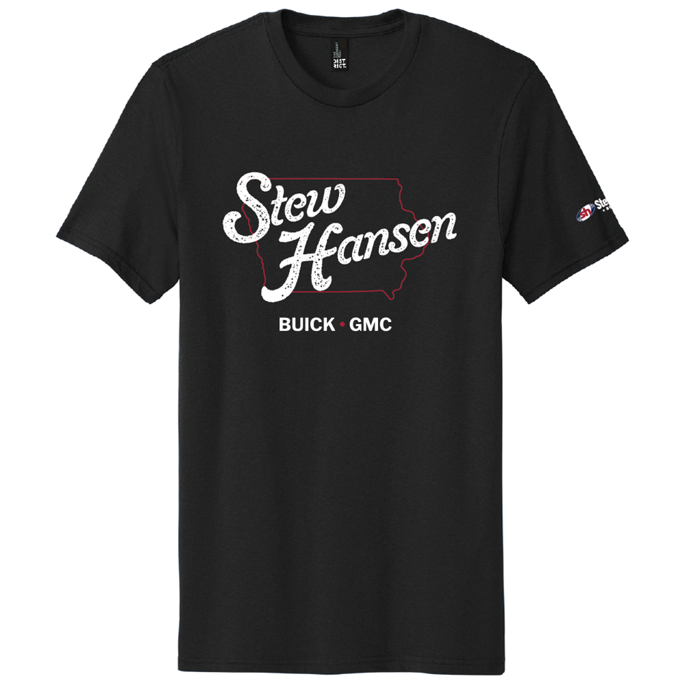 This preshrunk 4.5-ounce, 100% cotton T-shirt features a seamless double-needle 3/4" rib knit collar, taped neck and shoulder with rolled forward shoulders for better fit, and double-needle sleeves and hem. T-shirt features the "Stew Hansen Buick GMC logo on the full front and Stew Hansen logo on the left sleeve.
