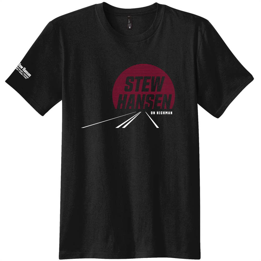 This preshrunk 4.5-ounce, 100% cotton T-shirt features a seamless double-needle 3/4" rib knit collar, taped neck and shoulder with rolled forward shoulders for better fit, and double-needle sleeves and hem. T-shirt features the "Stew Hanson on Hickman" logo on front in 2-color and the "Stew Hansen Chrysler * Dodge * Jeep * Ram * Fiat" logo on the sleeve in 1-color.