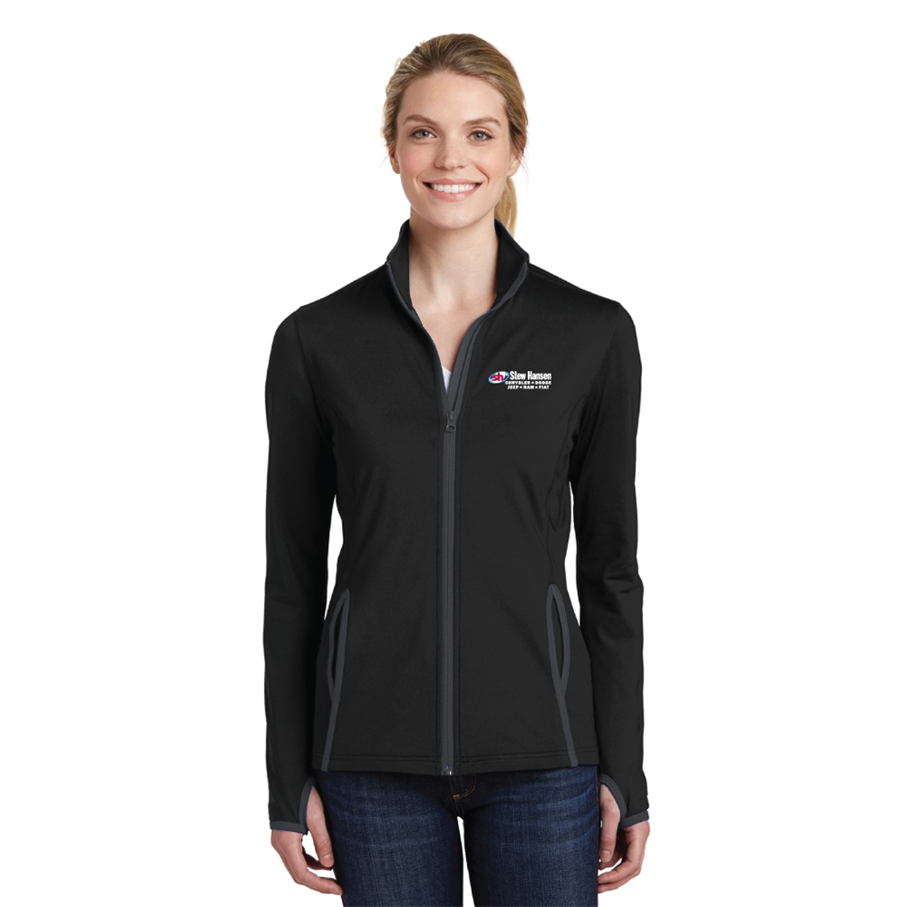 Keep moving in this 6.8-ounce, 90/10 poly/spandex moisture-wicking, soft-brushed jacket that's flexible and features hits of contrast color throughout.. Jacket features a cadet collar with contrast piping, contrast reverse coil zipper, set-in sleeves, contrast cuff binding, and contrast welt front pocket. Available in sizes XS-4XL with the Stew Hansen Chrysler * Dodge * Jeep * Ram * Fiat logo embroidered on the left chest.