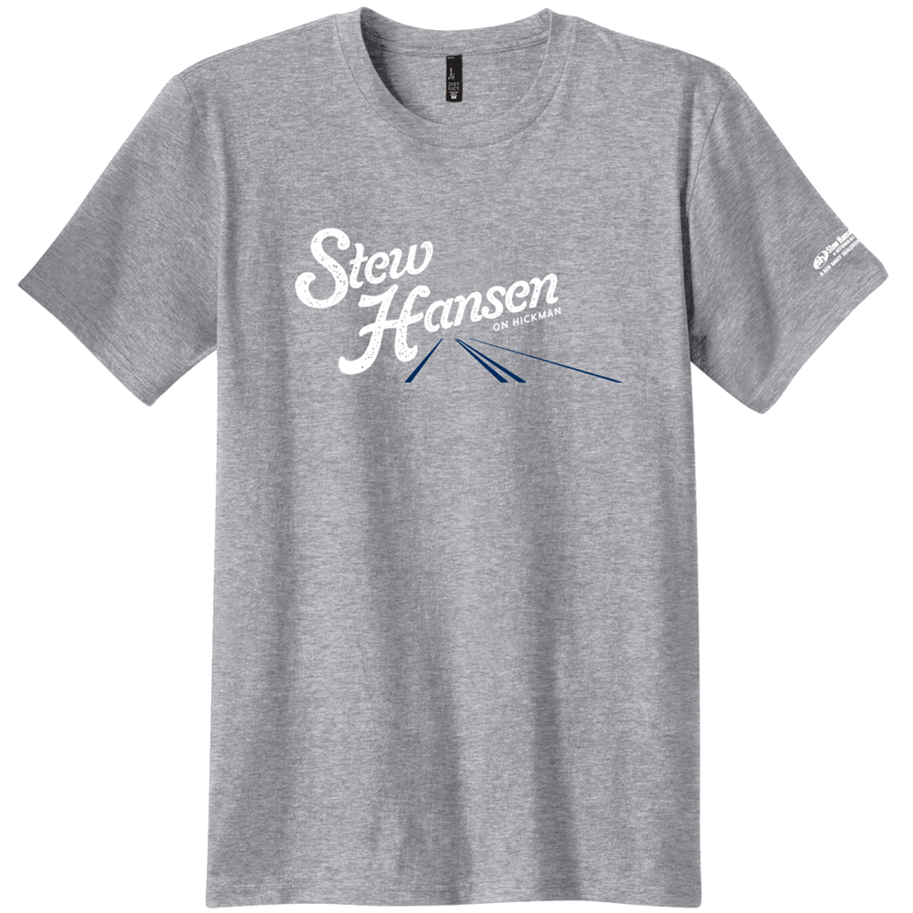 This preshrunk 4.5-ounce, 100% cotton T-shirt features a seamless double-needle 3/4" rib knit collar, taped neck and shoulder with rolled forward shoulders for better fit, and double-needle sleeves and hem. T-shirt features the "Stew Hanson on Hickman" logo on front in 2-color and the "Stew Hanson Hyundai" logo on the sleeve in 1-color.